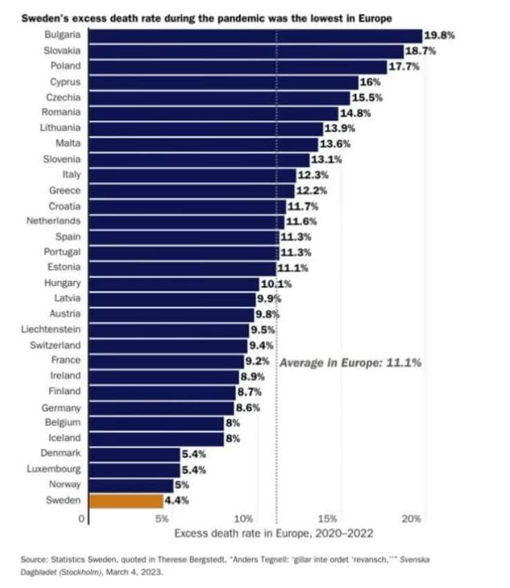 Ergo, tutti gli obblighi di mascherina più o meno grotteschi1 introdotti dai vari governi (soprattutto occidentali) sono stati nient’altro che frutto di muscolare e superstizioso decisionismo politico ma non hanno mai avuto niente di veramente scientifico. Del resto l’epidemiologo svedese Anders Tegnell, uno che le epidemie virali ad alta letalità le ha combattute davvero sul campo2, lo aveva già spiegato nel 2020, se solo qualche decisore al di fuori della Svezia si fosse degnato di ascoltarlo invece che ignorarlo o denigrarlo. I fatti hanno poi dato ragione a Tegnell, tanto che nel periodo pandemico 2020-2022 la Svezia, che non ha mai introdotto alcun obbligo di mascherina, ha registrato il numero più basso di morti in eccesso in tutta Europa, come si evince dal grafico sottostante:
