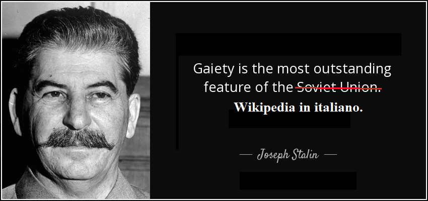 Che dire? Davvero un gran botta di allegria che illustra chiaramente e per l’ennesima volta in che mani è Wikipedia in italiano. Ci viene in mente una citazione involontariamente umoristica di Stalin, che parafrasiamo volentieri perché calza proprio a pennello: